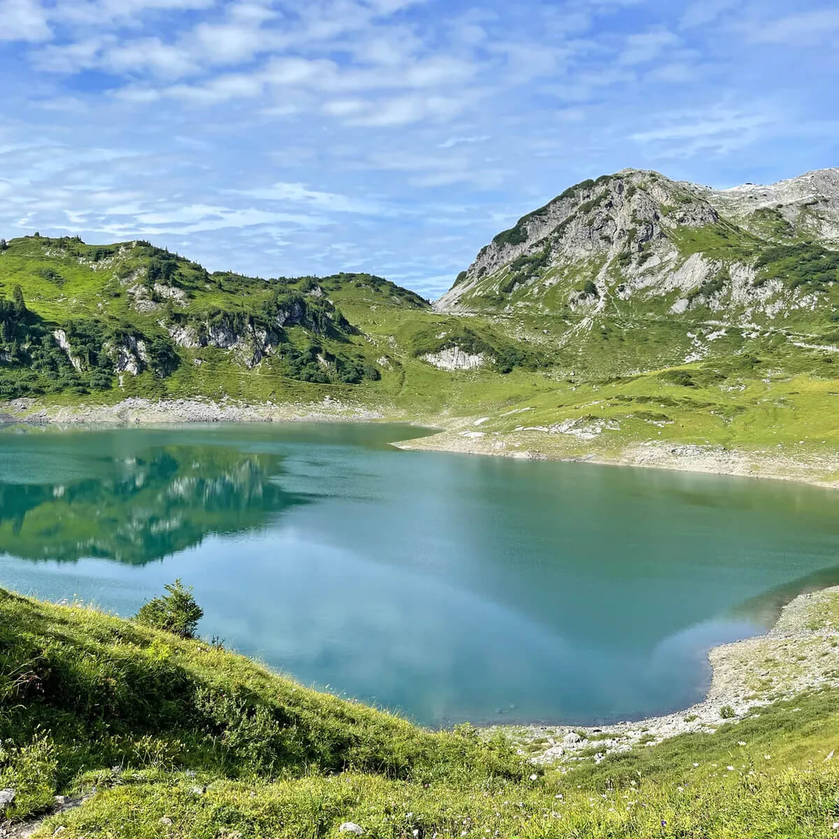 レッヒヴェークスタート地点かつハイライトのフォルマリン湖は、レヒ川の源流域に位置し、息を呑むほど美しいパノラマの景色で訪れる人々を魅了します。
