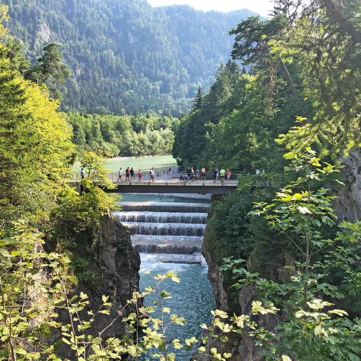 レヒ渓谷の壮大な景色と、はるか下に流れる神秘的なターコイズブルーの川の水面を垣間見ることができます。