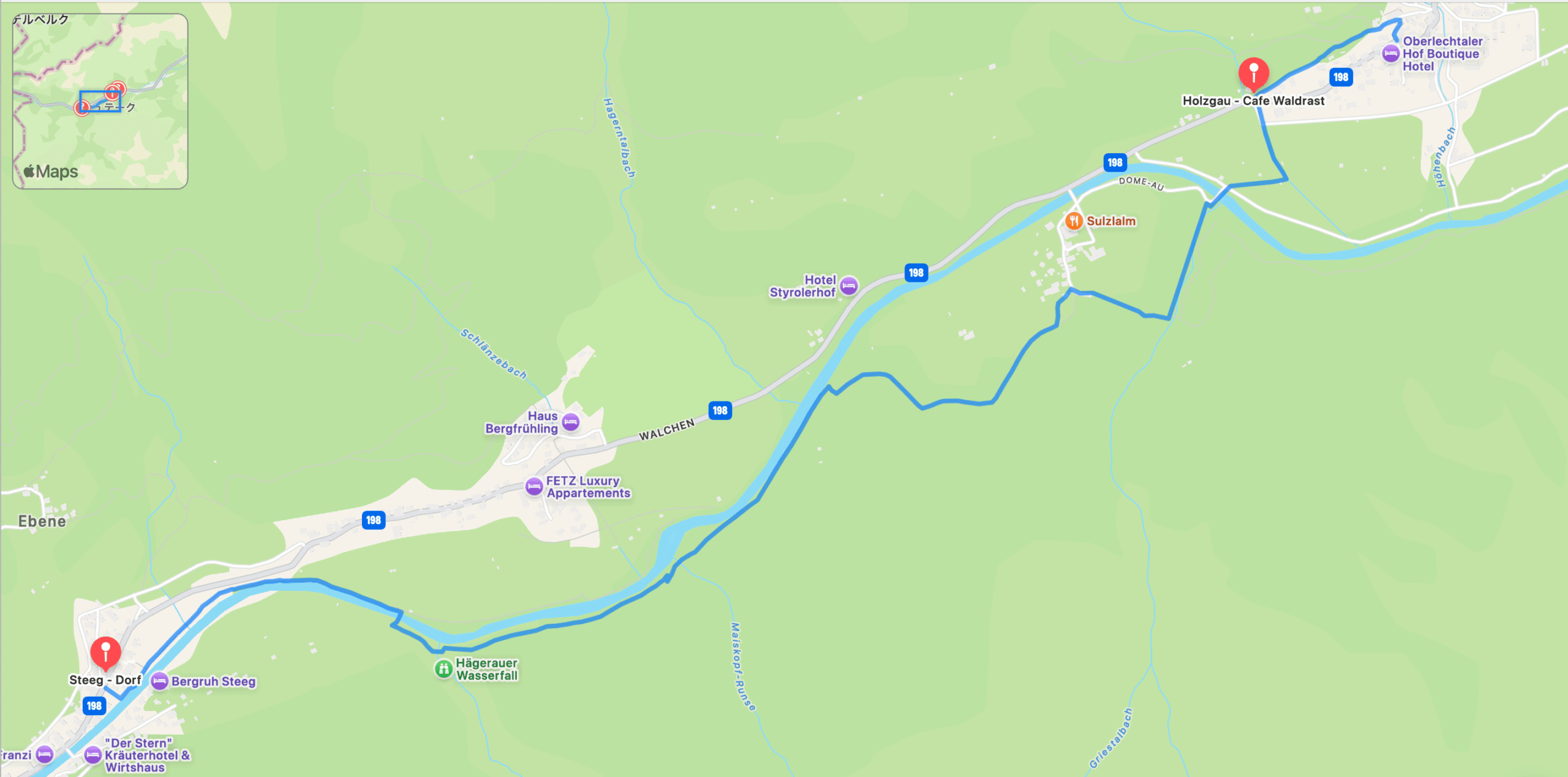 遊歩道を下ると、フォルダーホルンバッハに到着です。温暖な気候から、フォルダーホルンバッハは「レヒ渓谷の小さなメラーノ」という愛称で呼ばれています。