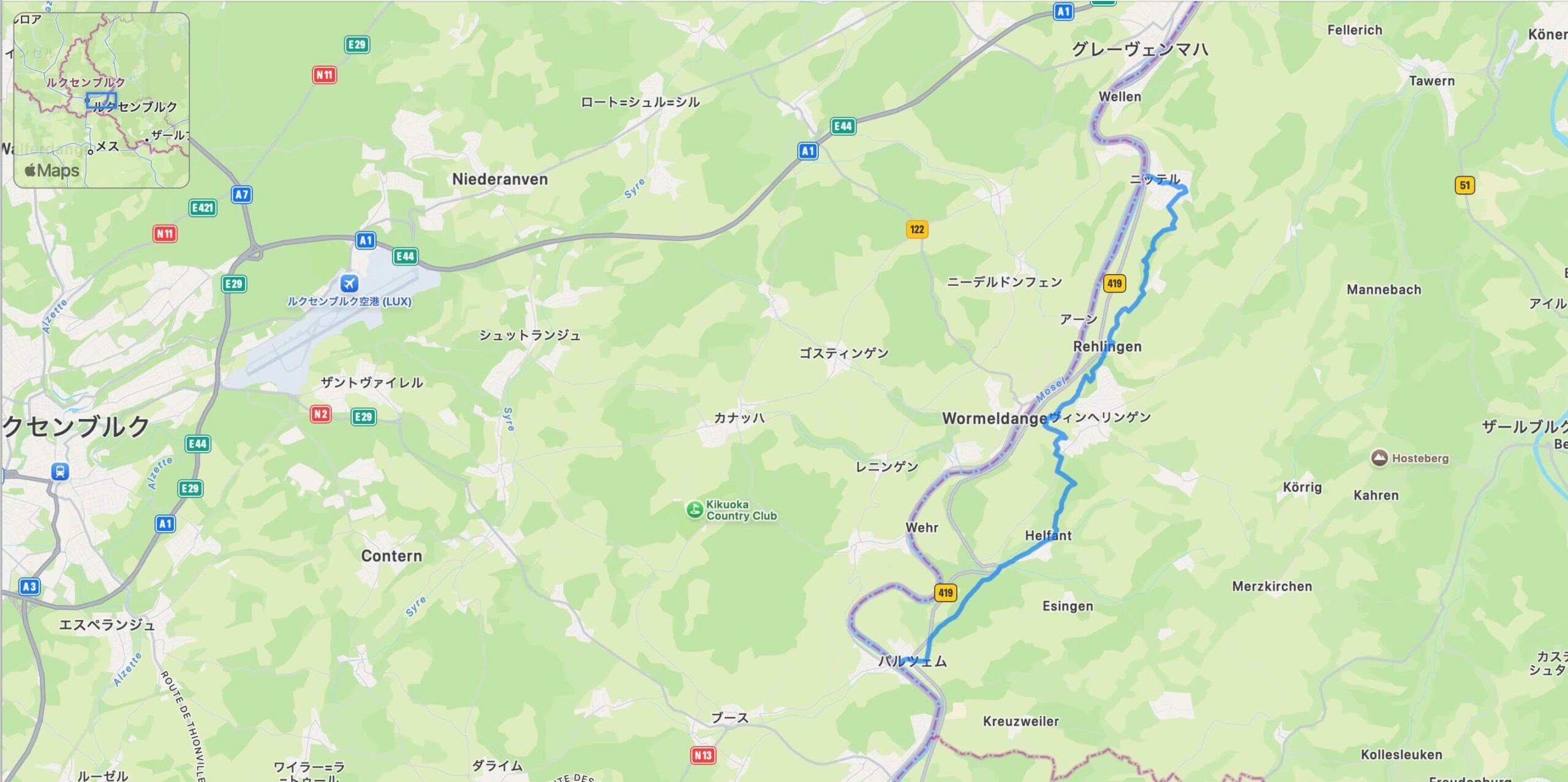 道中では、双塔を持つ印象的な教会「ヘルファント大聖堂」を望みながら、小さな集落や静かな森を通過。短いながらも急な登りが続く区間の後には、モーゼル渓谷とルクセンブルクの景色を一望できる展望ポイントが何度も現れ、歩く楽しさを一層高めます。
