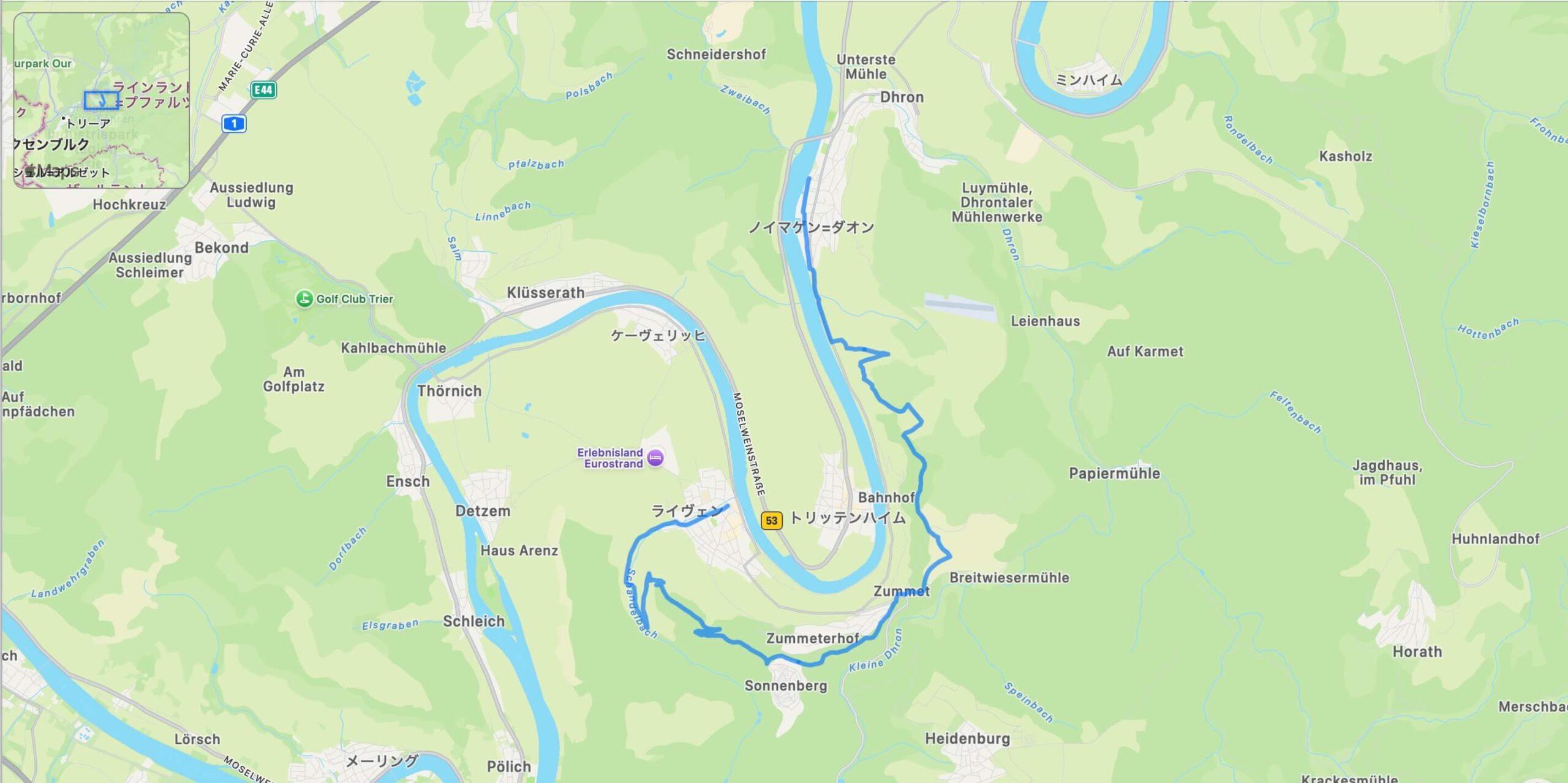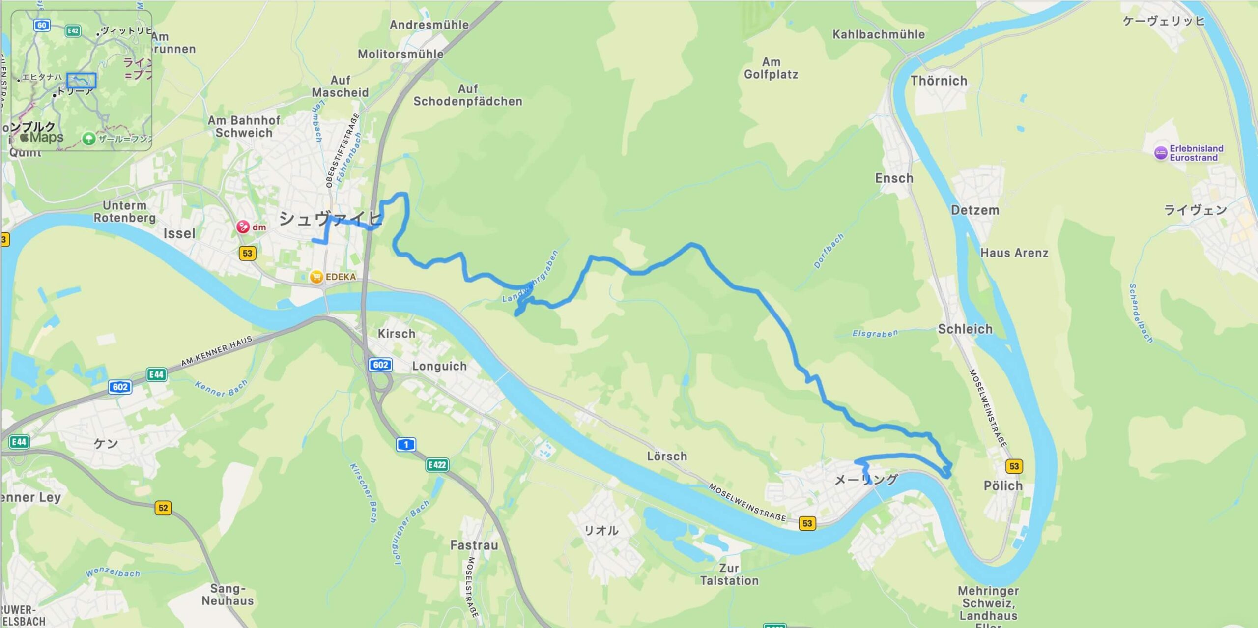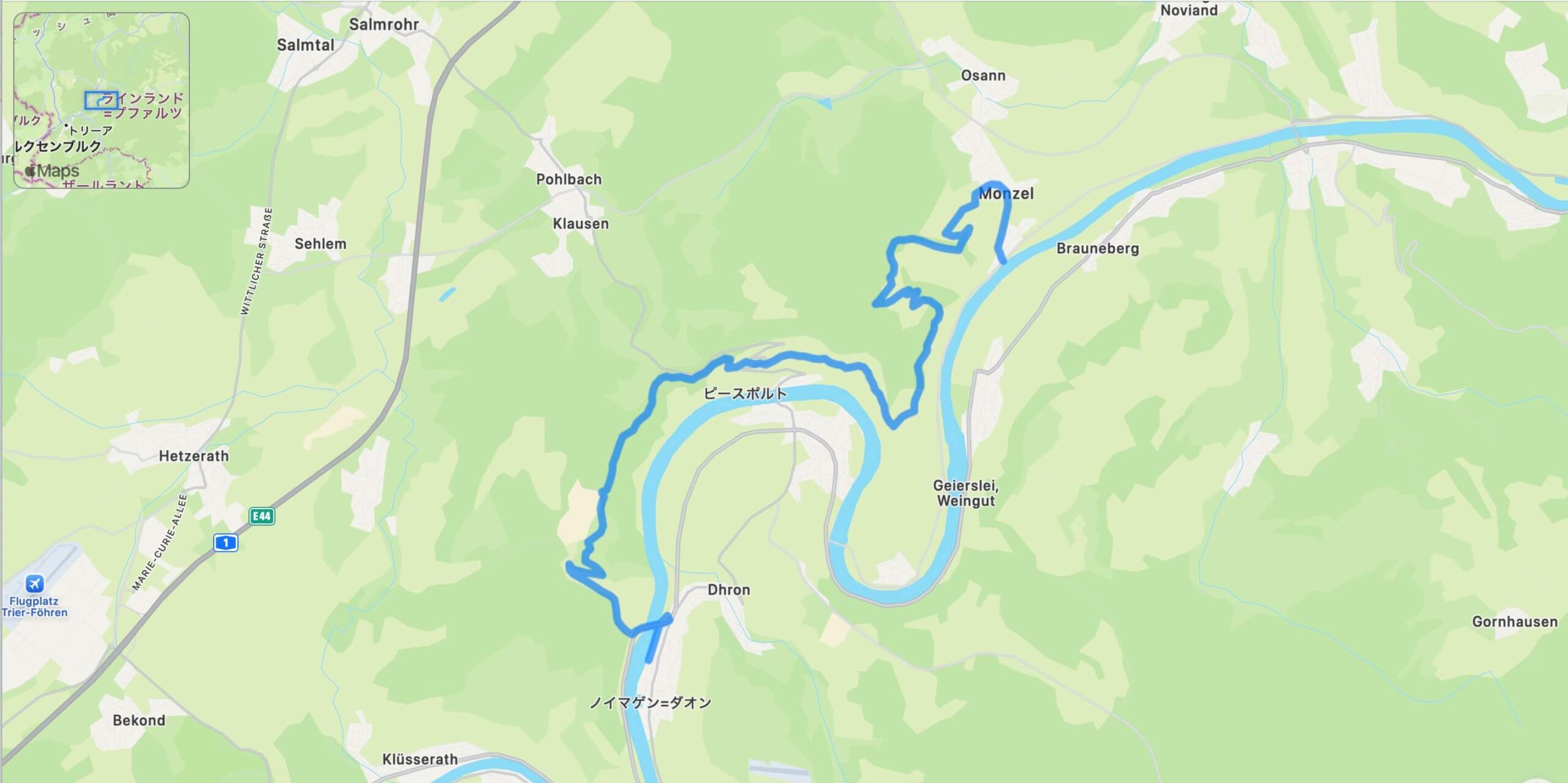 ドイツ最古のワインの町ノイマゲン=ダオンを出発し、旧モーゼル鉄道の築堤跡を横目に、川沿いの曳舟道をたどります。水辺に寄り添う区間は、モーゼルシュタイクの中でも特に川を身近に感じられる場所として印象的です。