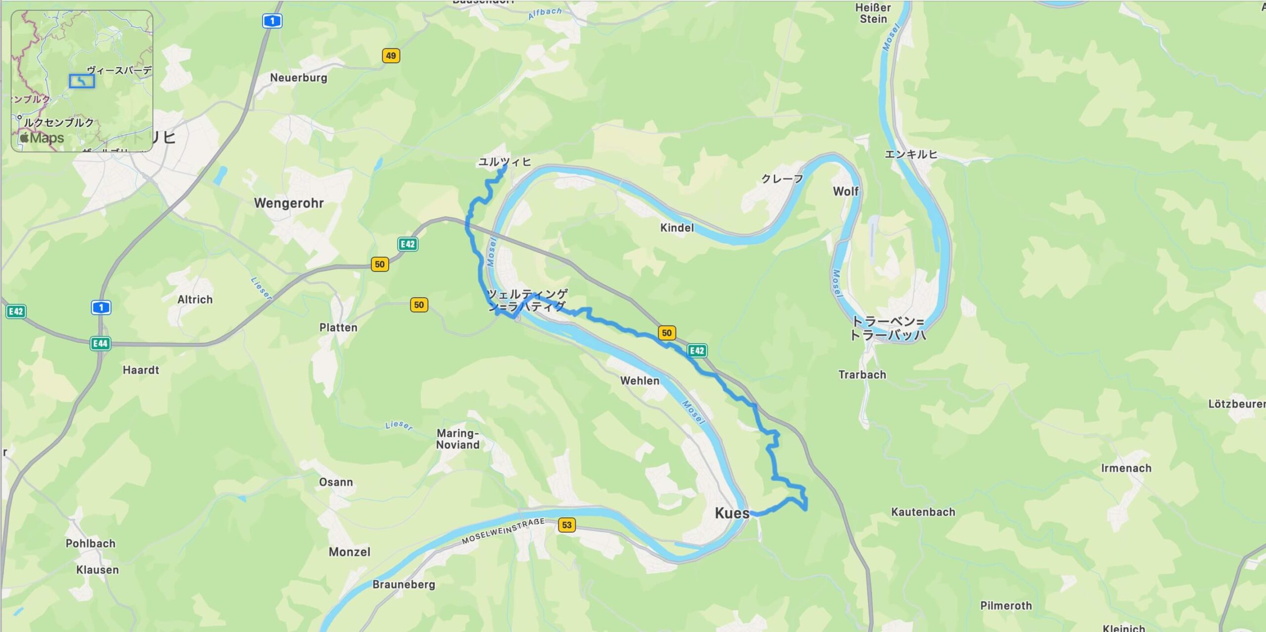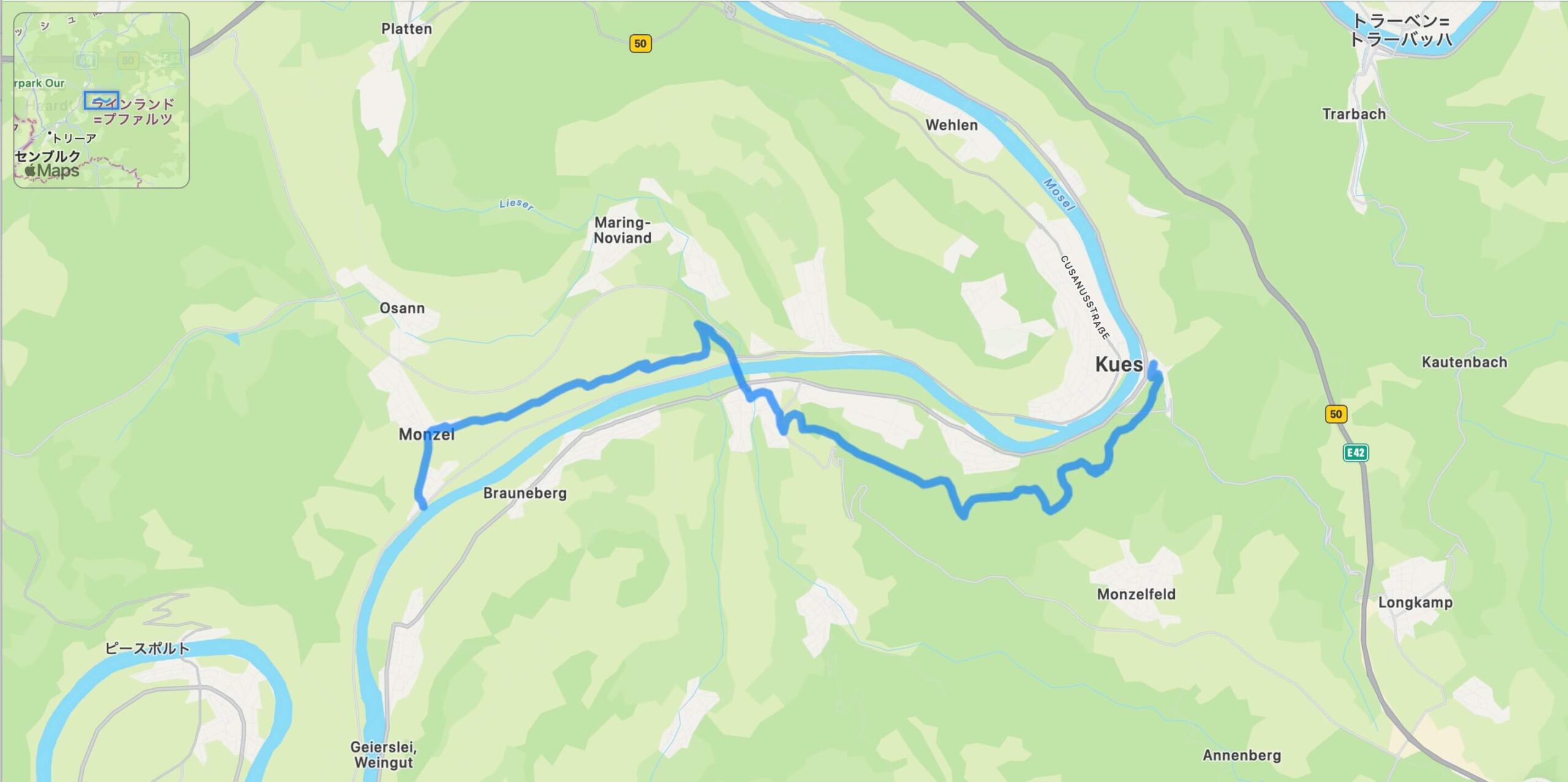 途中には展望ポイントや草地の道、急な下り坂、そしてブドウ畑の中を進む区間が続き、モーゼル地方特有のワイン文化と風景美を存分に味わえます。